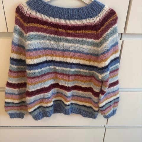 Strikket genser i nydelige farger. Strikket til min 10 åring men er litt stor. Vid i halsen. Vet ikke hva den er sttikket av.