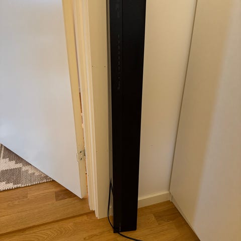 Bang & Olufsen Beolab 8000. Høyttaleren har slankt, søyleformet design med stofftrekk foran og metall-/glassdetaljer i foten.