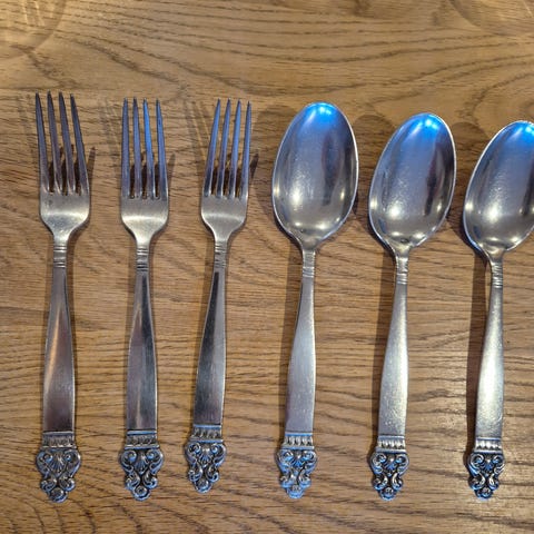 6 spiseskjeer , 6 t-skjeer, stor skjee, 6 gafler, 2 små gafler