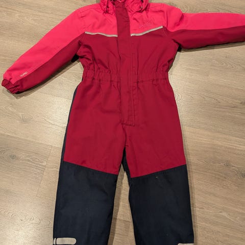 Modellen har hette, glidelås foran med klaff, strikk ved håndledd og ankler samt justering i livet. Det er glidelåslommer foran og refleksdetaljer på ermet. Materialet passer til lek ute i variert vær. Bildene viser noen merker og slitasje i stoffet. Gis derfor bort, mot henting. Sender ikke.