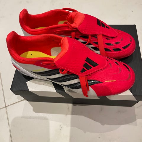 Adidas X fotballsko i oransje farge med hvite detaljer. Overdel i syntetisk materiale og yttersåle med faste knotter tilpasset spill på kunstgress/naturlig gress. Innside i gul/grønn kontrastfarge. Leveres med matchende rød Adidas-sko-/oppbevaringspose slik som vist på bildene. Egnet som lette fotballsko til trening og kamp. Størrelse og spesifikk modellvariant er ikke oppgitt i annonsen.