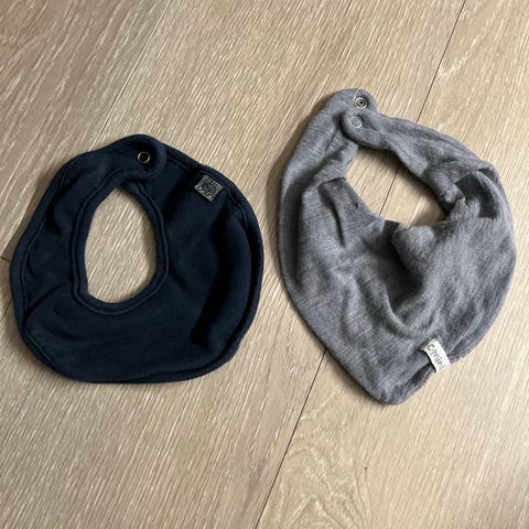 De beste smekkene. En mørkeblå, og en lyseblå med teksten "Bestefars tøffing". Den lyseblå smekken har fått noen lyse flekker, se bildet. Skjerfsmekken består av to lag stoff med en membran i midten, noe som gjør at de tåler mye mer før de blir våte igjennom. En blanding av økologisk bomull og polyester gjør smekken er myk og behagelig å ha på. Lett å lukke med trykknapper bak som kan stilles i to forskjellige størrelser.