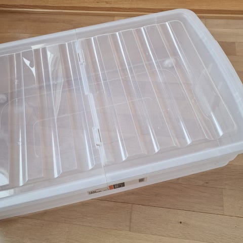 Lite brukt blank oppbevaringsboks på hjul, selges. Denne er på 80 liter.