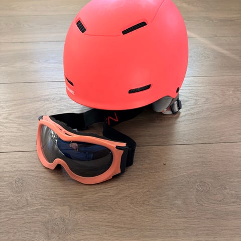 Uvex slalåmhjelm i størrelse XS (54 cm). Hjelmen er hvit med trykte motiver og har øreklaffer og justerbar hakestropp med klips. Egnet til alpint og annen vintersport. På bildene vises også skibriller som kan brukes sammen med hjelmen.
