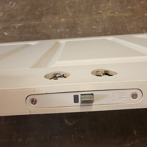 Innerdørblad til 800 karm. Brukt inn til bad, så den er kappet 25mm nederst for luftig inn på baderom. Svellet litt i låsekasse, og liten skade i nedre hjørne