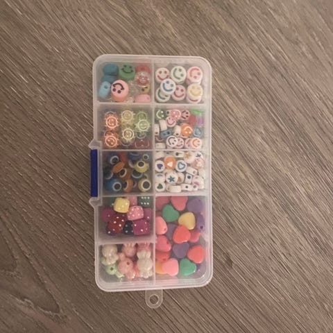 Perlesett med ulike plastperler sortert i flere oppbevaringsbokser. Inneholder hovedsakelig bokstavperler i forskjellige farger og former, samt perler med smilefjes og andre motiver. I tillegg følger det med små runde perler i ulike farger, blant annet turkis, sølv og hvit, i en blomsterformet boks med rominndeling.