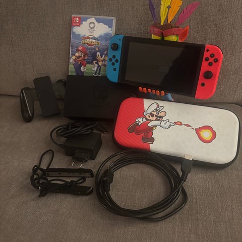 Selger ein nintendo switch spilkonsoll med mykje tilbehøyr. Skjermenbeskyttaren er litt oppskrapa, og burde kanskje byttast. Ladestasjon som og kan koblest opp til TV følgjer med. Alt fungerer som det skal.