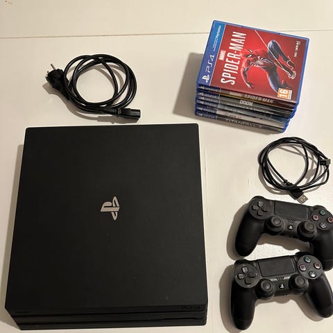 Konsollen på bildene er en PS4 Pro (CUH-72xx-serien) med tredelt design. Den leveres sammen med en Cepter håndkontroller i svart og tilhørende kabler som vises på bildene.