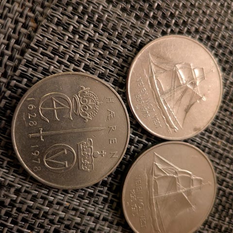 5 KRONER JUBILEUM 1975 KRONEMYNT,1975 UTVANDRINGEN OG 1978 HÆREN.