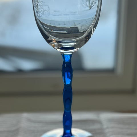 håndlagde Orrefors Alice vinglass med blå stett og fot, designet av Erika Lagerbielke.
