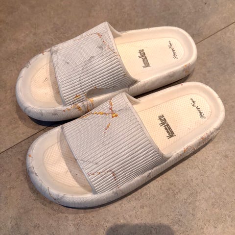 HappyFlops slippers i størrelse 37. Modellen er en åpen slip-on tøffel med bred rem over foten. Fargen er hovedsakelig hvit med marmorerte detaljer.