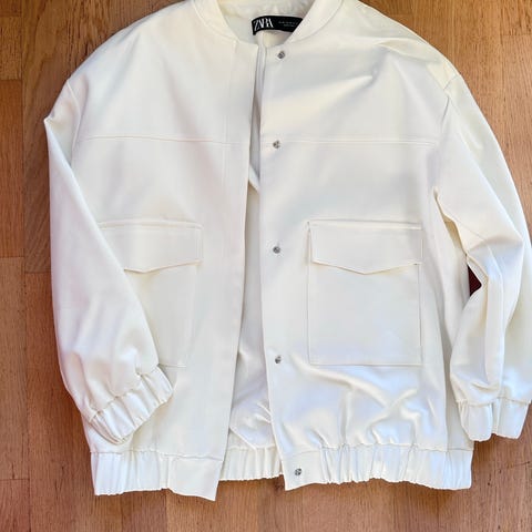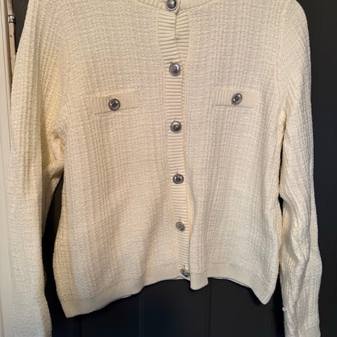 Zara jakke for dame i størrelse M. Jakken er i gullfarge og laget i akryl og polyester. Den har rund hals, lange ermer og knappelukking foran med kontrastknapper. Modellen har to frontlommer og rett fasong. Passer som lett ytterjakke eller som en cardigan-lignende jakke over andre plagg. Myk og behagelig . Lengde fra nakke. Og ned ca 44 cm . Lengde arm ca 44 cm. Lengde under arm til under arm ca 48 cm.