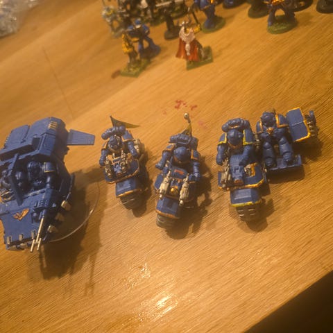 Warhammer 40,000 Space Marines miniatyrfigurer i blå farge. Figurenes detaljer er malt, med ulike våpen og utstyr representert. Egnet som samleobjekter, til bordrollespill og strategispill i Warhammer 40,000-universet. Passer til bruk på spillbrett, i dioramaer eller som malingsprosjekter for figurmaling.