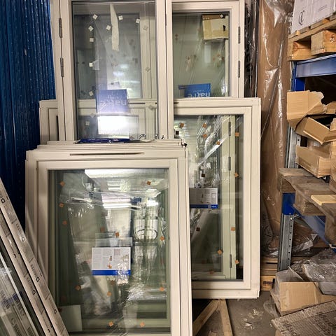 Vinduer med karm i glass, ett med hvit ramme og ett med brun ramme. Passer til bruk i for eksempel bod, garasje, anneks eller lignende bygg der det er behov for enkle vindusløsninger. Størrelse og type glass er ikke oppgitt og bør måles og kontrolleres før montering. Pris kan diskuteres