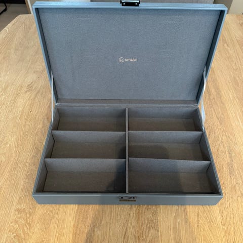 Selger en stor koffert full av briller, solbriller og brilleetuier.
