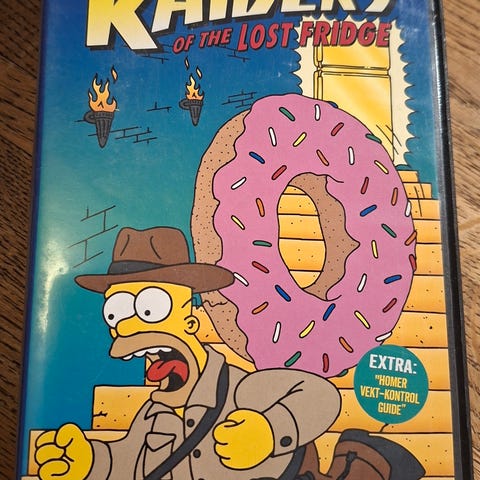 Selger samlerkassetten "The Simpsons Go to Hollywood" på VHS. Dette er den norske kjøpefilm-utgaven fra Egmont Entertainment, der vi ser Homer og Marge i stivpyntet Hollywood-stil på coveret.
