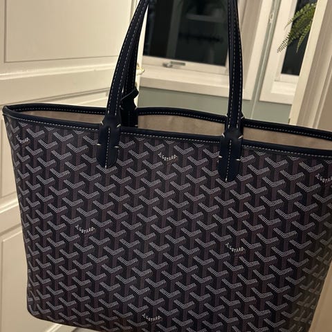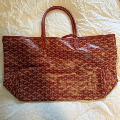 Goyard skinnveske for dame i rød farge. Vesken har karakteristisk mønster og bærehåndtak i skinn. Innvendig er det åpent hovedrom med lys innside som gir god oversikt over innholdet. Egnet til hverdagsbruk, jobb eller reise, med plass til personlige eiendeler som lommebok, nøkler, små elektroniske enheter og annet tilbehør.