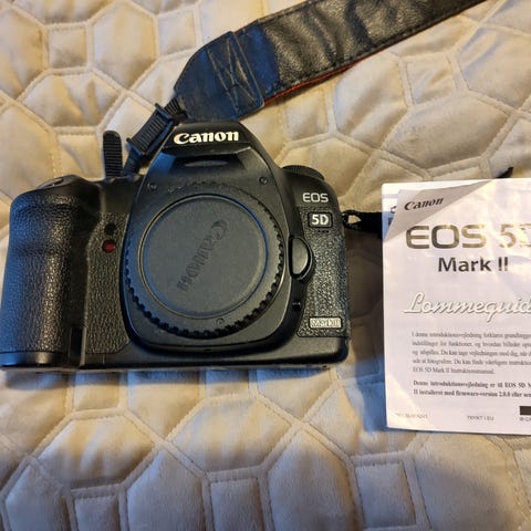 Svært pent brukt Canon 5D Mk II selges til hyggelig pris. Kun 6330 eksponeringer av anslått levetid på 150.000-200.000 eksponeringer. Original lader og batteri samt SD (CF) minnekort. Kun brukt innendørs i studio og har vært pakket bort siden overgang til digitalt mellomformat.