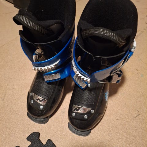 Nordica alpinstøvler i størrelse 225. Støvlene er i fargen svart med blått innerfôr og har flere justerbare spenner i metall for god tilpasning rundt fot og legg. Sålen har mønster for bedre feste ved gange på hardt underlag. Passer til bruk i alpinanlegg