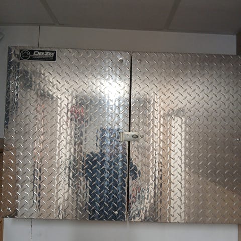 Verktøyskap i metall med flere skuffer. Skapet har grå hovedfarge med rød seksjon, og er utstyrt med uttrekkbare skuffer i front. Bildene viser målebånd som angir høyde, bredde og dybde på skapet, slik at det er enklere å vurdere plassbehov. Egner seg til oppbevaring av verktøy, smådeler og annet utstyr i garasje, verksted eller bod. Skapet står på gulv og har glatt overflate som er enkel å tørke av.