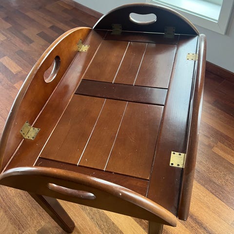 Godt brukt bord fra Reprodux. Den heter Butlers tray. Trenger litt kjærlighet så kan det bli ganske fint. Bordbein kan man klappe sammen. Bordet kan gjøres om til et serveringsbrett hvor sidene på bordet kan dyttes opp sånn at den får en kant. Må hentes.