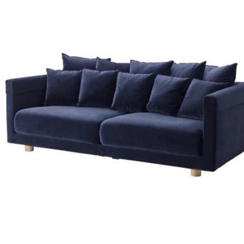 Stoff i svart velour som er spesialbestilt. Lite bruksmerker, men noe solbleiket på et par av putene.