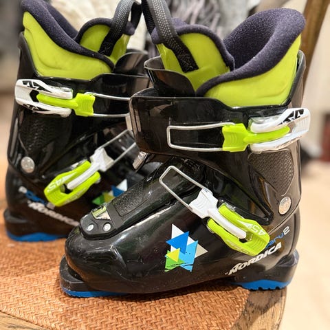 Nordica Dobermann Team og Dalbello Menace 2 alpinstøvler for barn i størrelse 205 (247 mm sålelengde). Ett par hvite støvler med blå detaljer og ett par gjennomsiktige/grå støvler med gule og svarte detaljer. Begge parene er tospenns alpinstøvler tilpasset barn, egnet til bruk med vanlige alpinbindinger. Støvlene har justerbare spenner og polstret innersko for støtte og komfort. Passer til barn som trenger alpinstøvler med sålelengde 247 mm.