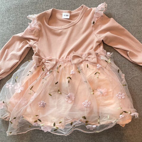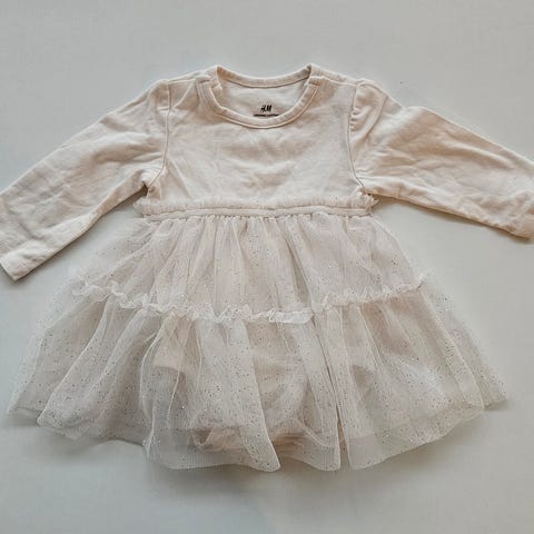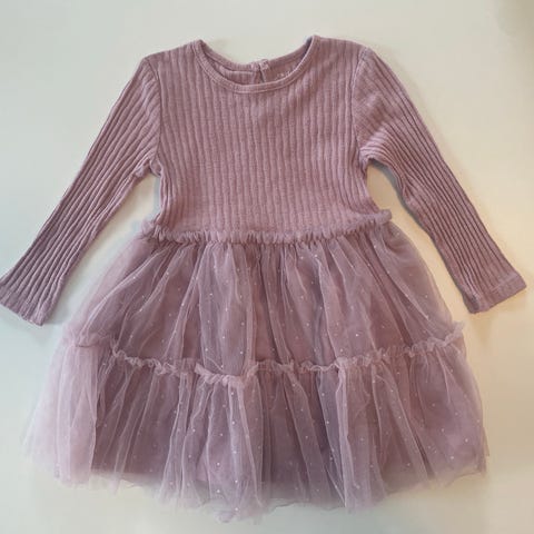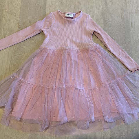 Jeg selger en kjole fra Primark i 100 %, som er som ny. Overdelen har ribbestrikket struktur og lange ermer, mens skjørtet har flere lag med tyll. Størrelse 74. Jeg ha også en lik kjole i str 80, for evt. søskenmatch