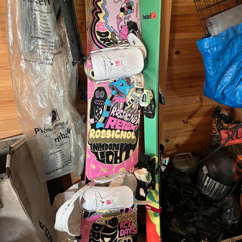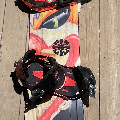 Snowboardpakke med snowboard, bindinger og snowboardstøvler. Bildene viser to brett med monterte bindinger samt to par snowboardstøvler med snøring. Utstyr egner seg til bruk i alpinbakke. Nøyaktig lengde på brett og størrelse på støvler er ikke oppgitt og bør kontrolleres ved interesse.