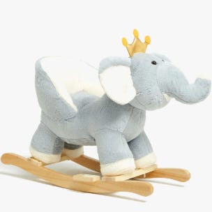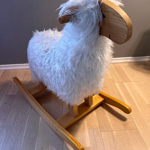 Teddykompaniet gyngehest utformet som en sau. Lekedyret har stabil gyngebunn i tre og myk, langhåret plysj i hvitt på kroppen. Hodet og beina er i tre med enkle, avrundede former. Passer som rideleke for små barn og som dekorativt innslag på barnerommet. Egnet for innendørs bruk.