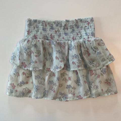 Jeg selger et skjørt fra KappAhl som er som ny. Skjørtet har lett og luftig stoff og volanger nederst. Skjørtet har bred, elastisk smocklinning i livet for god passform. Flerfarget med sommerfugler