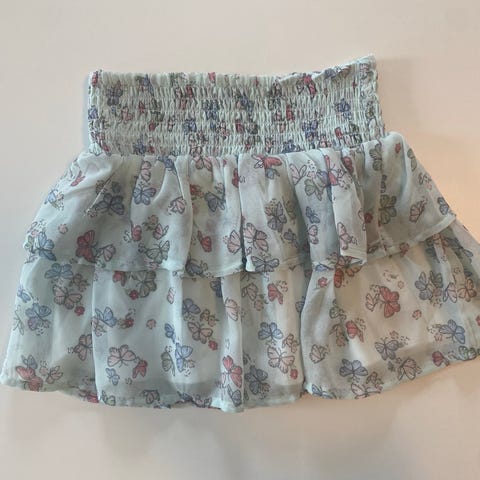 Jeg selger et skjørt fra KappAhl som er som ny. Skjørtet har lett og luftig stoff og volanger nederst. Skjørtet har bred, elastisk smocklinning i livet for god passform. Flerfarget med sommerfugler
