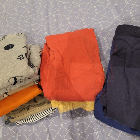 Klespakke med 18 plagg, bukser, skjorter, shorts, singlet, genser og jakker. Det meste pent brukt, noe godt brukt.