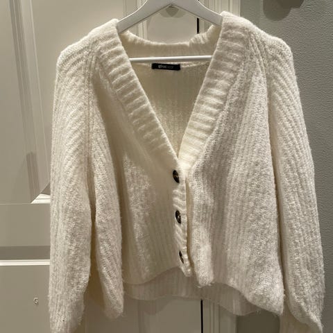 Hvit strikkejakke i ull og mohairblanding str L t.s. kr 300,-