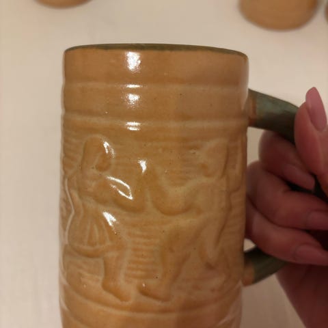 Mugard keramikk krus i rektangulær form med håndtak. Krusene har beige glasur utvendig med dekorert fuglemotiv og plantemotiv i brune og grønne toner, samt mørk glasur innvendig og på håndtaket. Egner seg til varme og kalde drikker. Selges som sett på to krus.