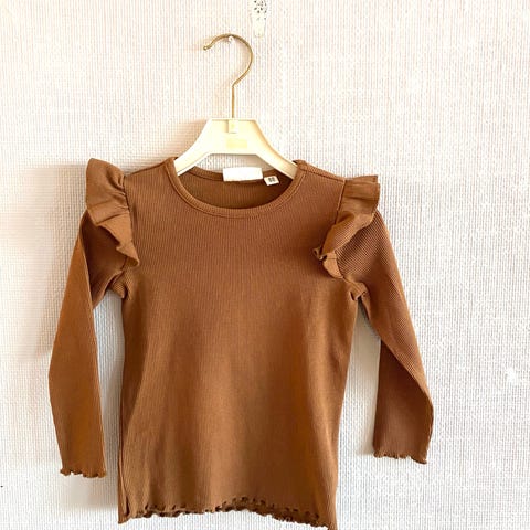 Søkeord: hm genser, h&m barn, ribbestrikket topp, volang genser, jente 110, jente 116, barneklær, høstklær barn, hverdagsklær, terracotta genser, langermet topp, jenteklær 🌿