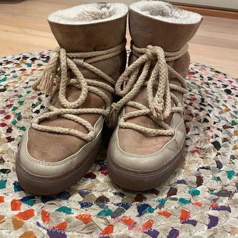 Inuiiki vinterstøvler i størrelse 37. Støvlene har beige overdel med kombinasjon av glatt og semsket materiale, samt kraftige, lyse snøringer foran. Innvendig er de fôret med lyst, mykt materiale som gir ekstra varme. Sålen er flat og mørkere i fargen, med god bredde for stabilitet. Passer til bruk på kalde dager og til hverdagsbruk i vinterhalvåret.