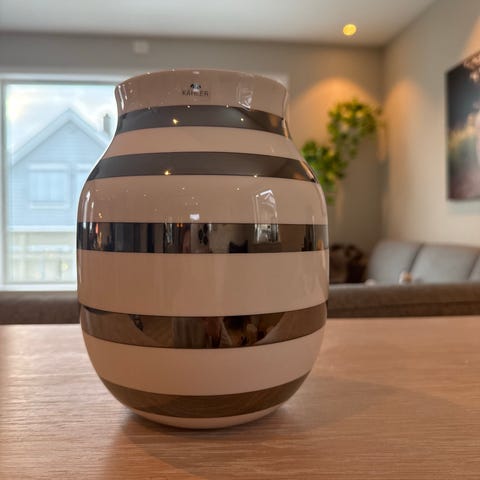 Kähler Omaggio vase i keramikk med horisontale striper. Vasen har et klassisk stripemønster i kontrastfarger og en avrundet form med smalere åpning øverst. Egnet til bruk som blomster- eller dekorasjonsvase i ulike rom i hjemmet. Vasen er 31cm høy og ca 20 cm bred. Må hentes på Rosenhoff i Oslo, veldig nærme kollektivt. Se også gjerne mine andre annonser - legger ut etter hvert!