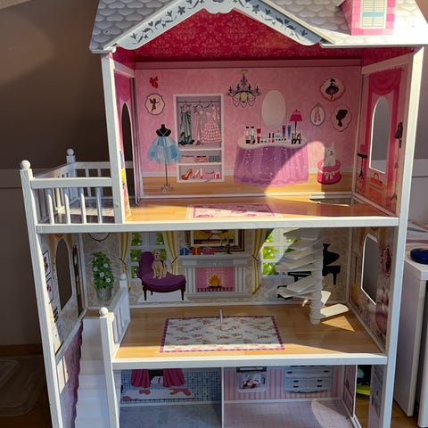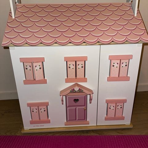 Fine Little Day dukkehus i tre, med rosa fasade og hvite detaljer. Huset har flere etasjer og rom, med åpne sider og dører som kan åpnes for enkel lek og innredning. Taket er mørkt og kontrasterer mot den lyse fasaden. Innvendig er huset i naturfarget tre med flere rominndelinger og vinduer. Egnet som dukkehus til barnerom eller som dekorasjon i interiøret. Kan ikkedemonteres, må hentes
