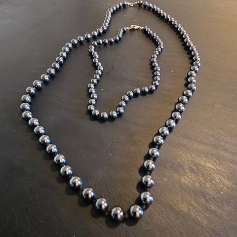 To flotte kjeder med sorte turmalinperler. Perlene har en behagelig speilglatt og skinnende overflate og god tyngde. Solid kvalitet! Ligger kjølige mot huden og reflekterer det omliggende lyset. Kjedene har ulik lengde og lager et to-raders halsbånd hvis brukt sammen. De kan sendes.