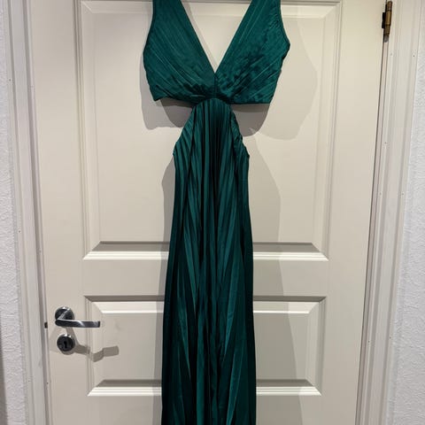 Abercrombie & Fitch festkjole for dame i XS. Kjolen er gul og laget i sateng. Modellen er tidløs med stroppeløst liv og plisséskjørt. Stropper kan settes på og følger med. Glidelås i ryggen for lukking.