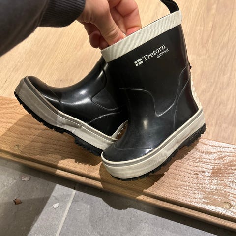 Selger et par mørkeblå Tretorn Nikki gummistøvler for barn i str 21. Litt slitasje i noen punkter under sålen, men den har en kraftig og god såle så det har ingen betydning. Stabile og gode til små føtter!