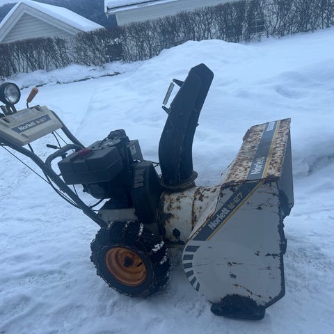 Gammel snøfreser selges den starter og går fint, fremdrift fungerer ikke. Vaier bør byttes. Skovlene er sveiset/ skjøtet inne ved akselen men dette har fungert i mange år uten problemer. Antagelig friksonshjul som må byttes. Byttet 1 hjul i høst. Åpen for bud!!!