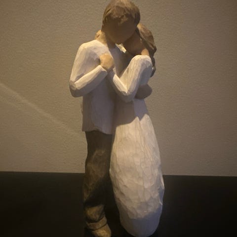 Willow Tree Remember figur. Dekorativ figur i utskåret stil, forestiller en person i lang kjole som holder en liten metallblomst i hånden. Figuren har en nøytral, lys fargepalett og karakteristisk stil uten ansiktstrekk, typisk for Willow Tree-serien. Egner seg som pyntegjenstand i hjemmet eller som minnefigur. Merket under med «Willow Tree Remember» og produsert av Demdaco.