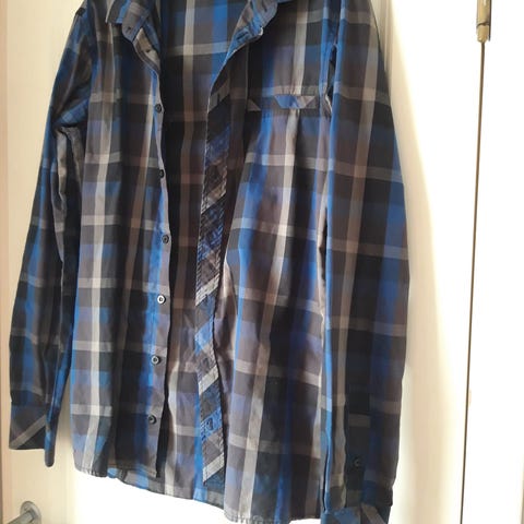 H&M skjorte for herre i størrelse M. Skjorten er blå og laget av bomull. Klassisk modell med krage og knappelukking foran. Passer til hverdagsbruk eller enklere formelle anledninger.