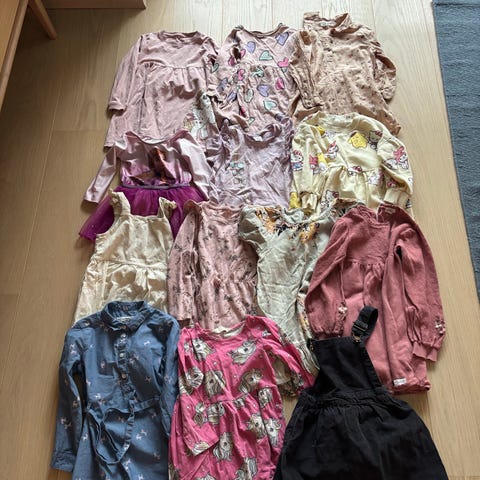 Åtte fine kjoler fra Name It, Lindex, Sarah og Mayoral. Alle kjolene fremstår hele og pene og pent brukt. To av kjolene har en liten anmerkning, som er avbildet og beskrevet (se nærbilde). Selges til en veldig god pris.