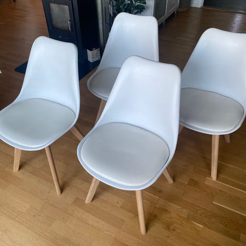 Hvitmalte kjøkkenstoler. I god stand men er litt røffe. Kan lett males på nytt om man ønsker det.