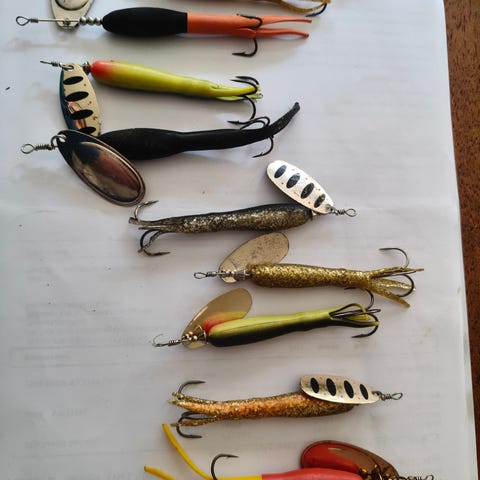 Mepps nr 5 og noen fra Kina pluss en mepps Anglia long laksespinnerere.4 er brukt 1 gang og resten er nye.