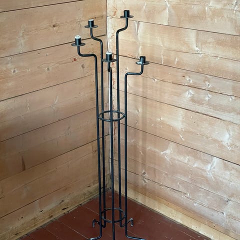 Vaskestell bestående av bolle, mugge og liten skål i blomstrete keramikk, plassert i et frittstående metallstativ. Bollen har rund form med dekor av flerfargede blomster i bunnen og langs kanten. Muggen har hank, helletut og tilsvarende blomsterdekor på siden. Den lille skålen er også rund med blomsterdekor og egen holder på stativet. Stativet er i mørkt metall med tre ben og ringformede holdere til bolle, mugge og skål. Egnet som tradisjonelt vaskestell, dekorasjon eller innredningselement på bad, soverom eller gang.