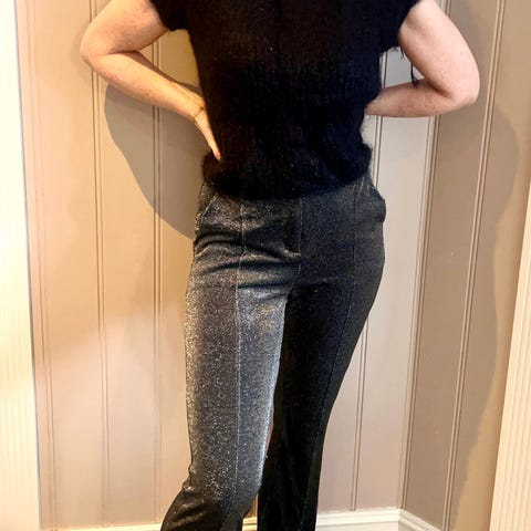 Sort bukse ned rette ben, og knyting i livet.